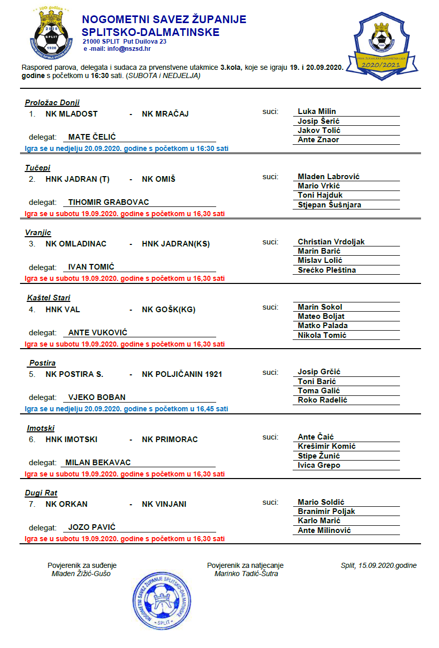 Raspored parova, delegata i sudaca za 3. kolo 1. ŽNL
