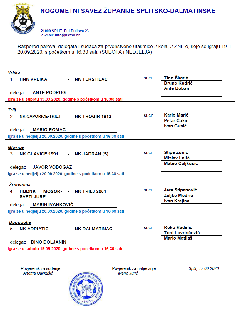 Raspored parova, delegata i sudaca za 2. kolo 2. ŽNL