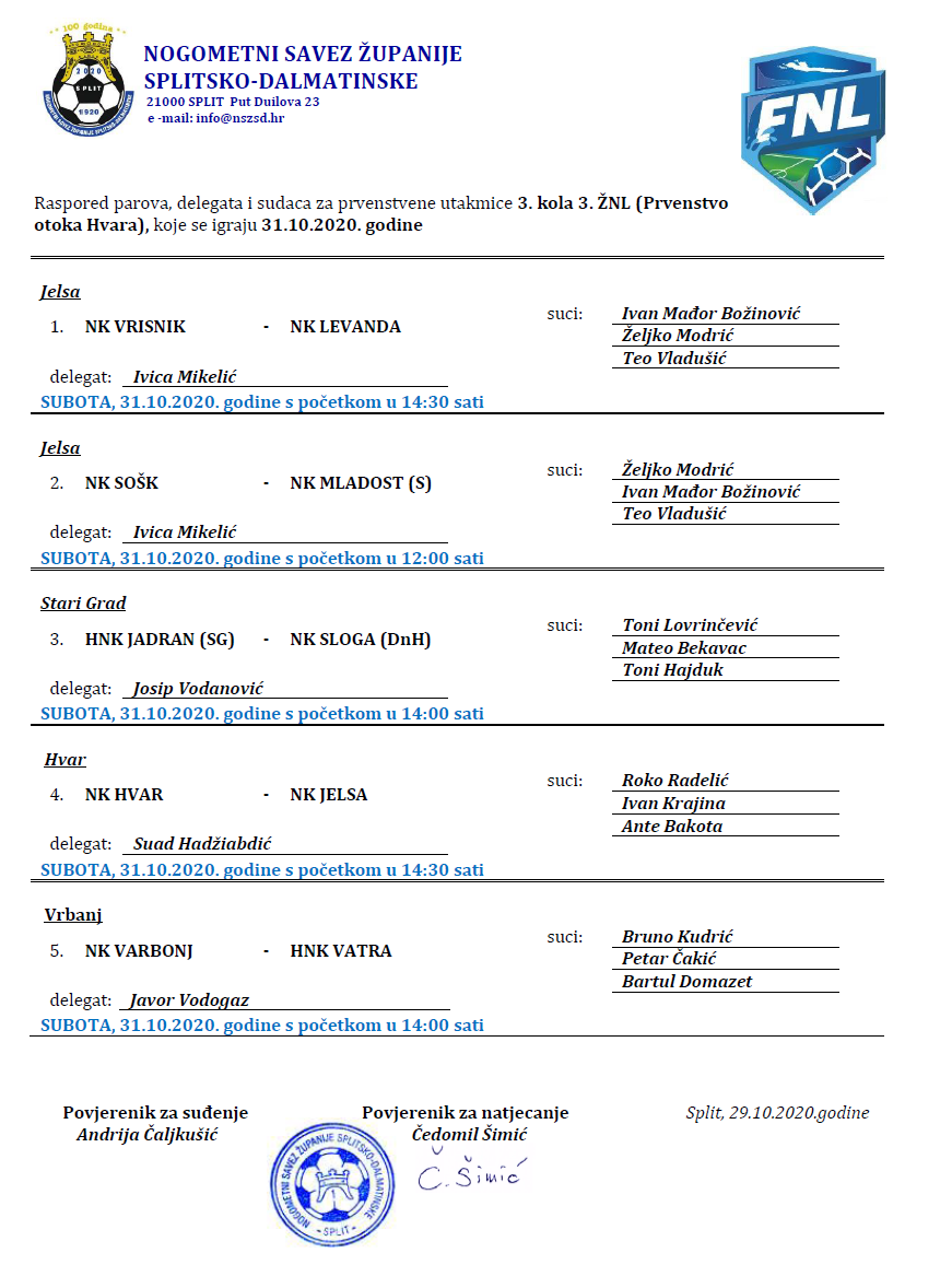 Raspored parova, delegata i sudaca za prvenstvene utakmice 3. kola 3. ŽNL (Prvenstvo otoka Hvara) koje se igraju 31.10.2020. godine