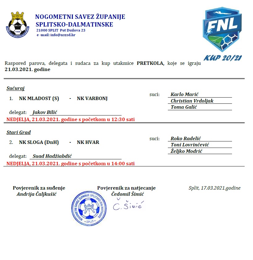 Raspored parova, delegata i sudaca za pretkolo Kupa otoka Hvara