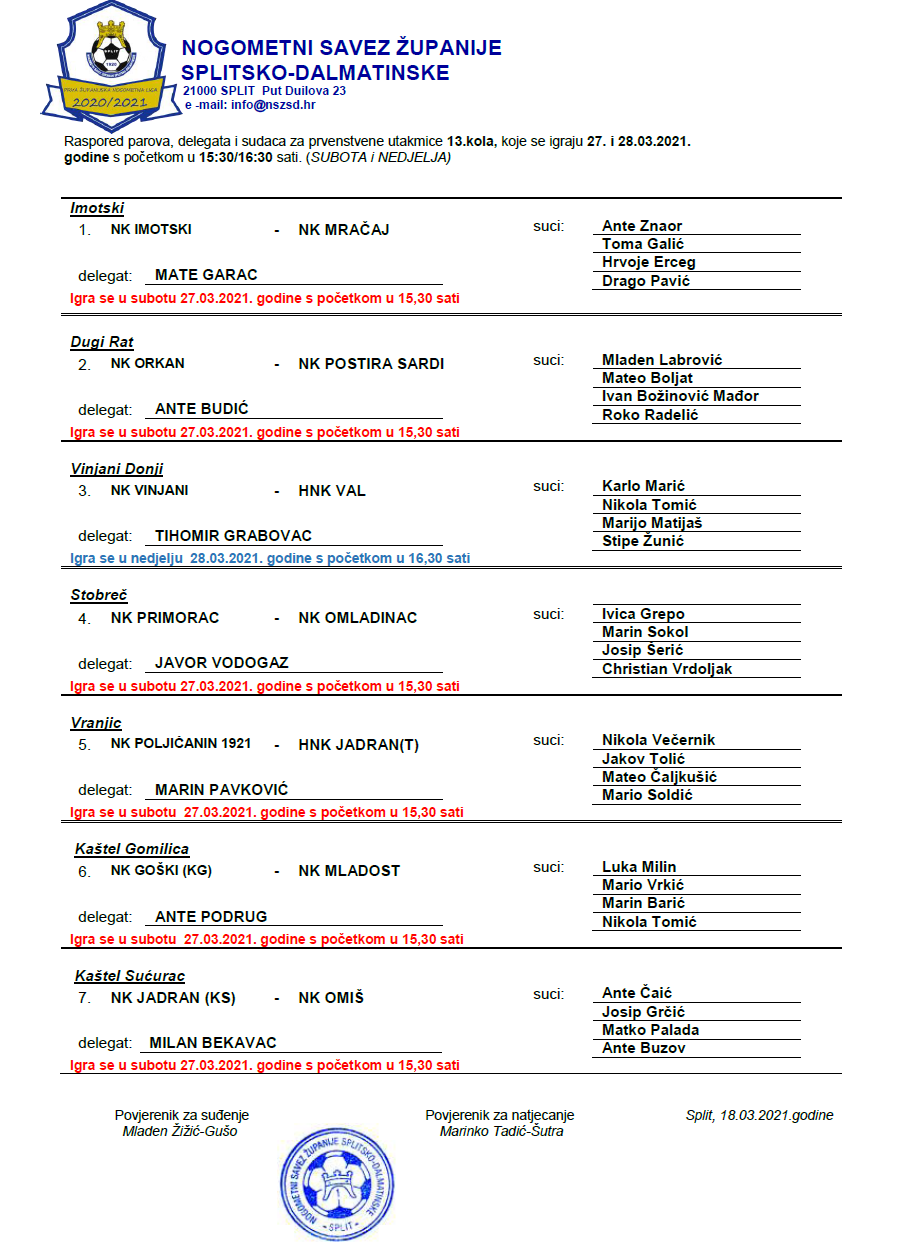Raspored parova, delegata i sudaca za 13. kolo 1. ŽNL