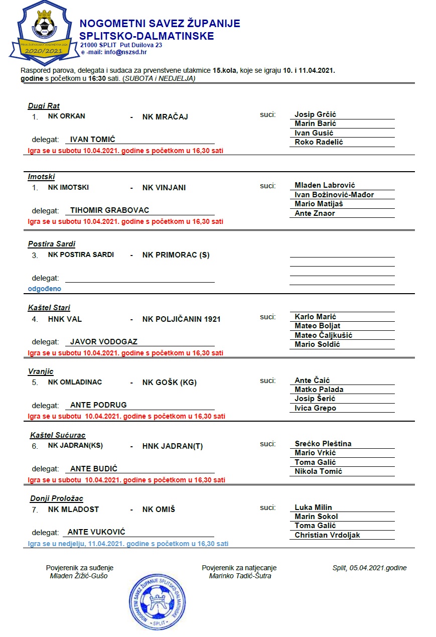 Raspored parova, delegata i sudaca za 15. kolo 1. ŽNL
