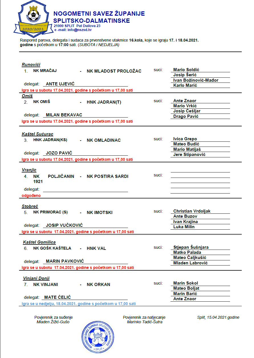 Raspored parova, delegata i sudaca za 16. kolo 1. ŽNL