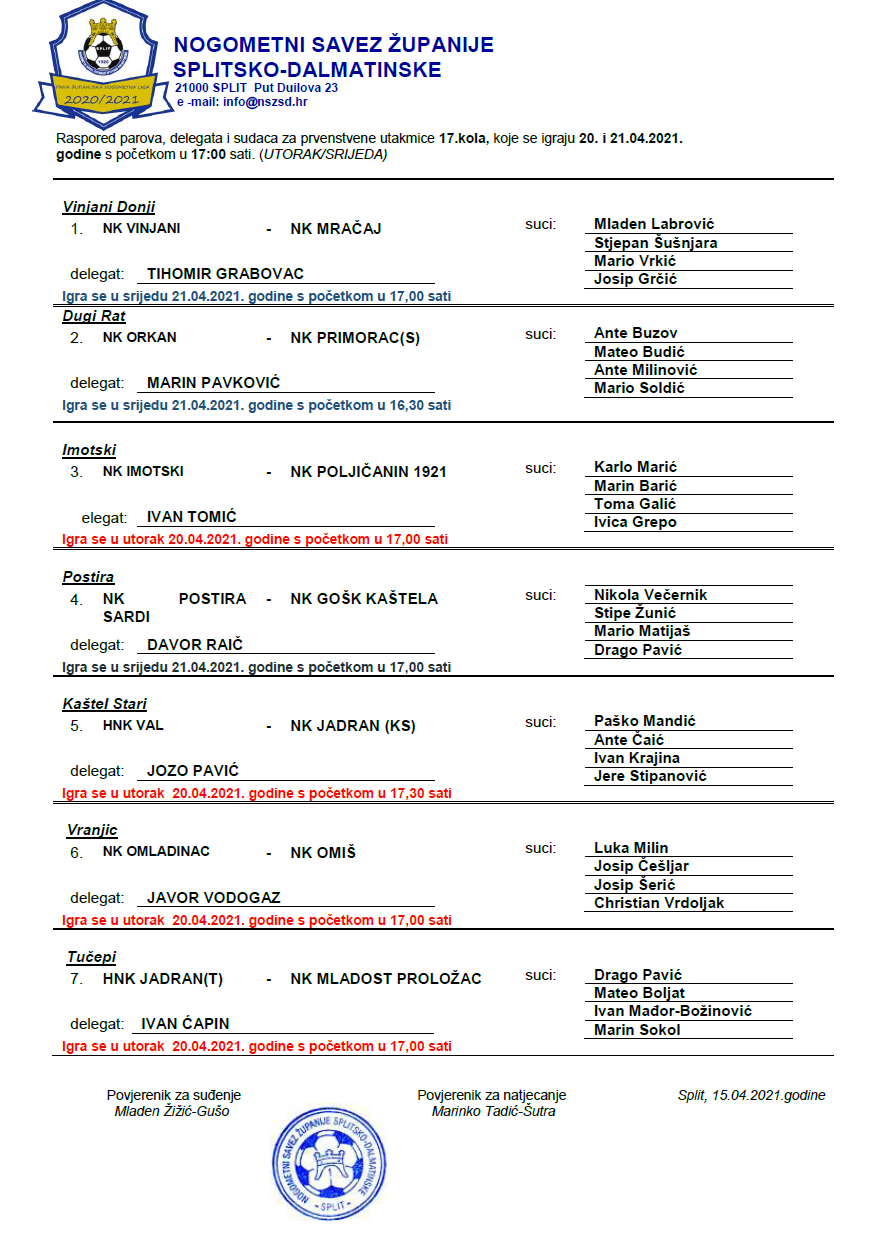 Raspored parova, delegata i sudaca za 17. kolo 1. ŽNL
