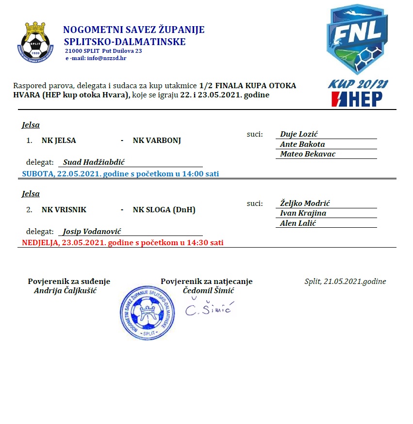 Raspored parova, delegata i sudaca za kup utakmice 1/2 finala Kupa otoka Hvara (HEP kup otoka Hvara)