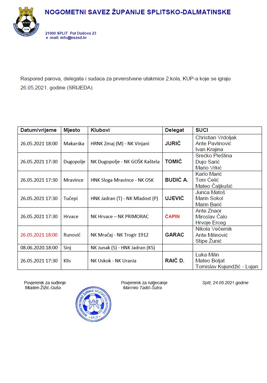 Raspored parova, delegata i sudaca za utakmice 1/8F kupa