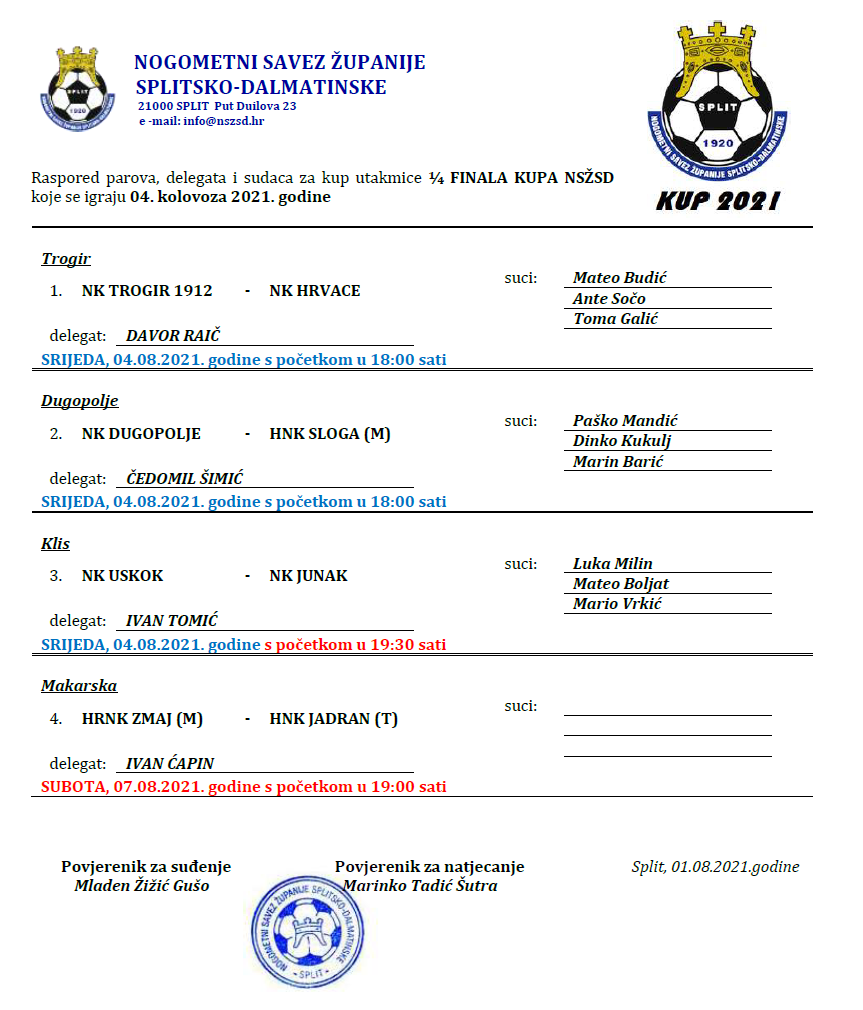 Raspored parova, delegata i sudaca za utakmice 1/4F kupa