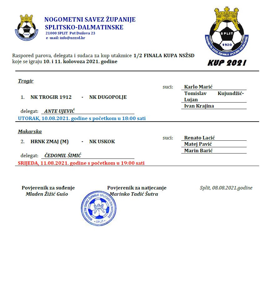 Raspored parova, delegata i sudaca za utakmice 1/2F kupa