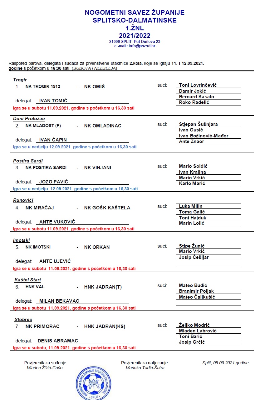 Raspored parova, delegata i sudaca za 2. kolo 1. ŽNL