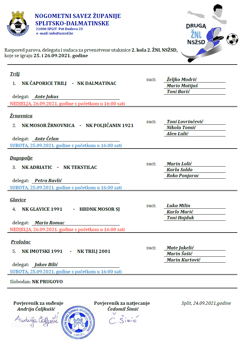Raspored parova, delegata i sudaca za 2. kolo 2. ŽNL
