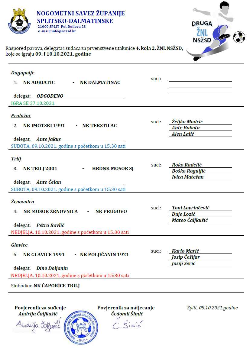 Raspored parova, delegata i sudaca za prvenstvene utakmice 4. kola 2. ŽNL