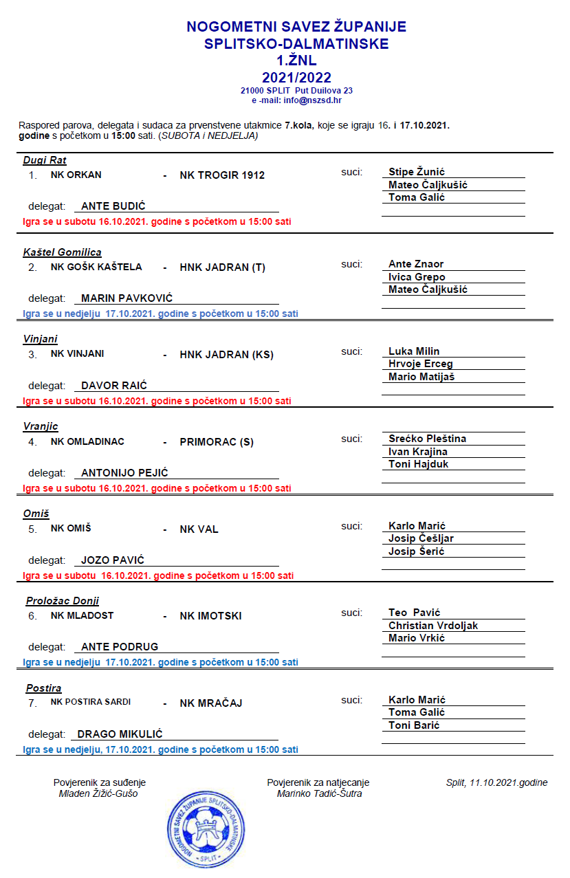 Raspored parova, delegata i sudaca za 7. kolo 1. ŽNL