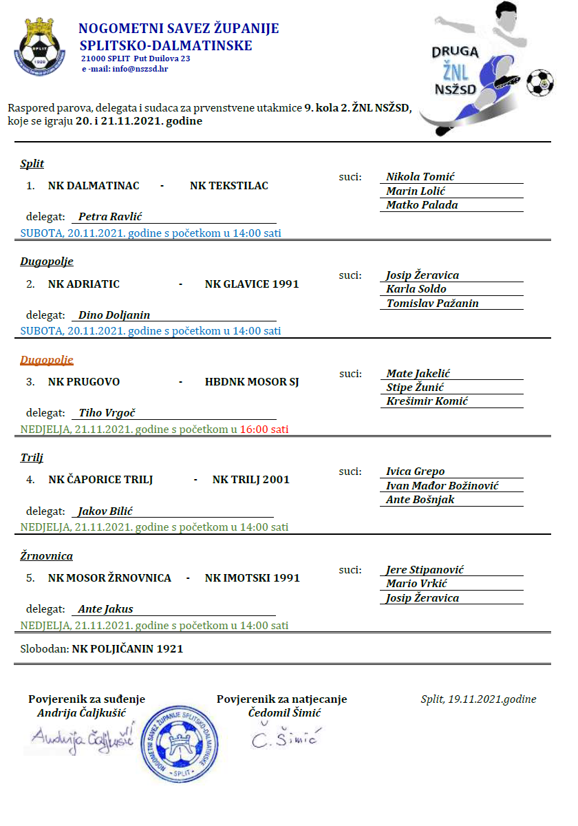 Raspored parova, delegata i sudaca za prvenstvene utakmice 9. kola 2. ŽNL