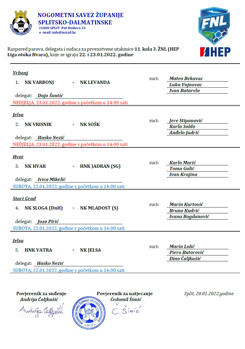 Raspored parova, delegata i sudaca za prvenstvene utakmice 11. kola 3. ŽNL (HEP Liga otoka Hvara) koje se igraju 22. i 23.01.2022. godine