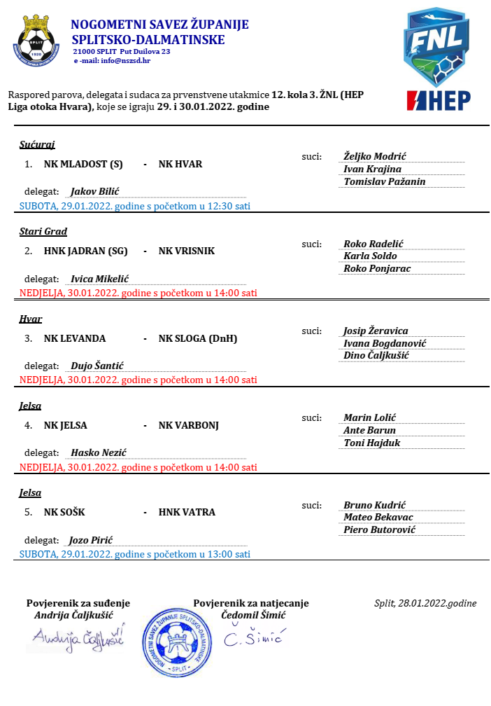 Raspored parova, delegata i sudaca za prvenstvene utakmice 12. kola 3. ŽNL (HEP Liga otoka Hvara) koje se igraju 29. i 30.01.2022. godine