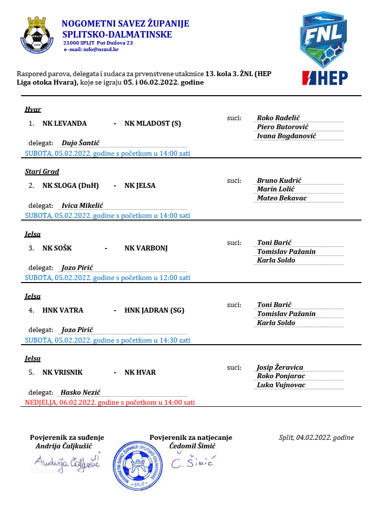 Raspored parova, delegata i sudaca za prvenstvene utakmice 13. kola 3. ŽNL (HEP Liga otoka Hvara) koje se igraju 05. i 06.02.2022. godine