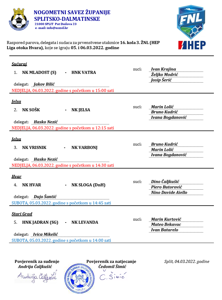 Raspored parova, delegata i sudaca za prvenstvene utakmice 16. kola 3. ŽNL (HEP Liga otoka Hvara) koje se igraju 05. i 06.03.2022. godine