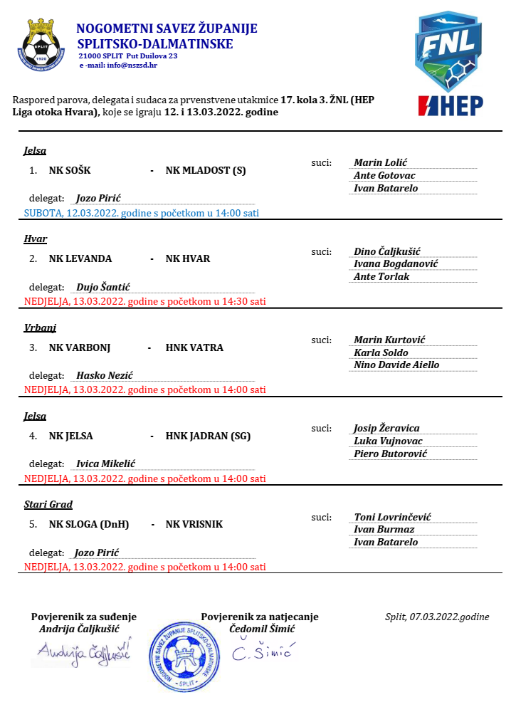Raspored parova, delegata i sudaca za 17. kolo 3. ŽNL (HEP Liga otoka Hvara)