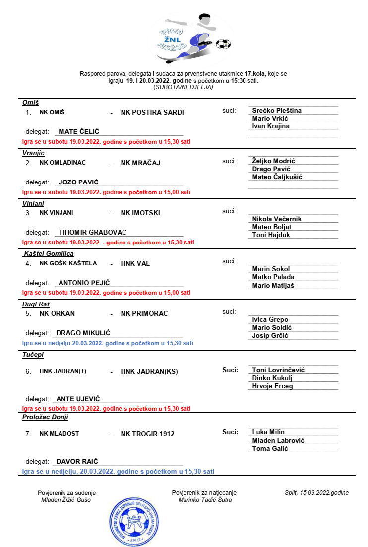Raspored parova, delegata i sudaca za 17. kolo 1. ŽNL