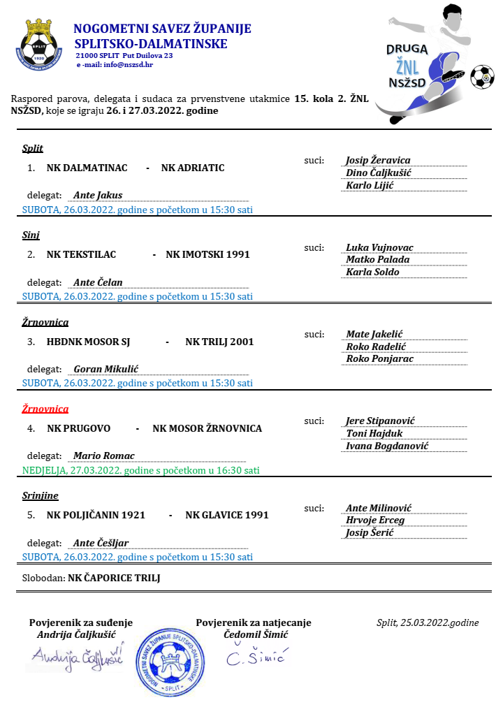 Raspored parova, delegata i sudaca za 15. kolo 2. ŽNL