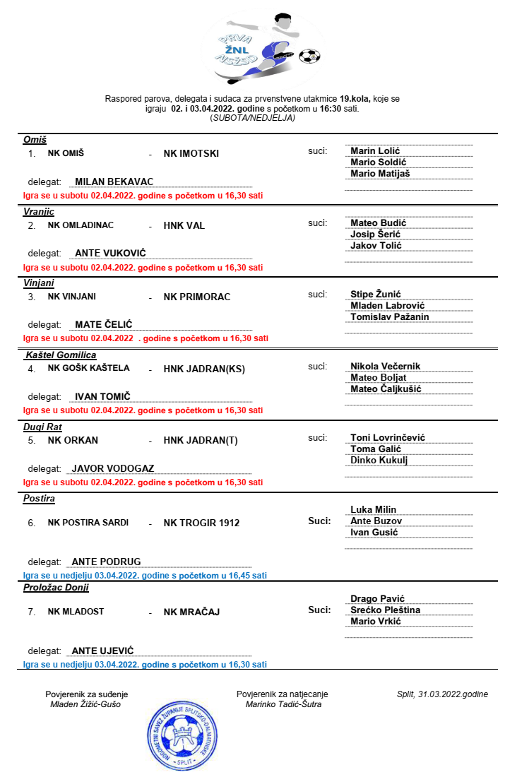 Raspored parova, delegata i sudaca za 19. kolo 1. ŽNL