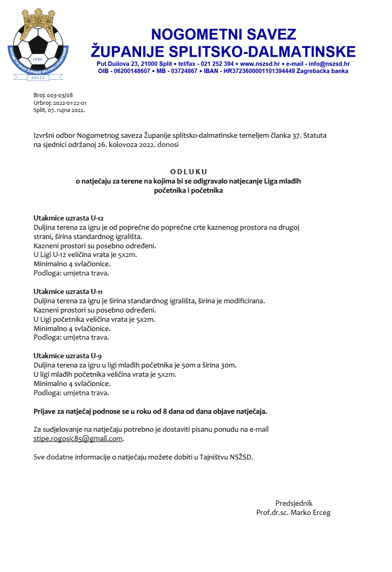 NATJEČAJ ZA TERENE NA KOJIMA BI SE ODIGRAVALA NATJECANJA LIGA MLAĐIH POČETNIKA I POČETNIKA