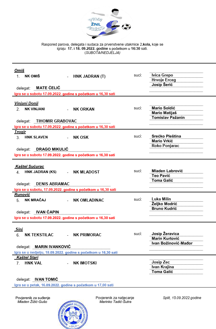 Raspored parova, delegata i sudaca za 2. kolo 1. ŽNL