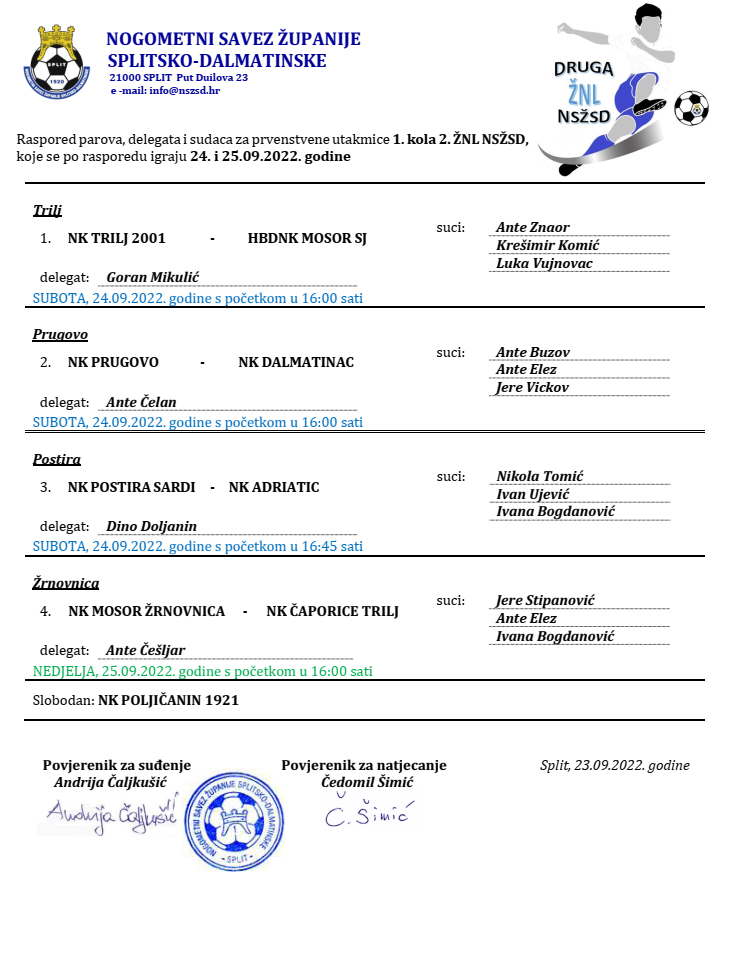 Raspored parova, delegata i sudaca za prvenstvene utakmice 1. kola 2. ŽNL