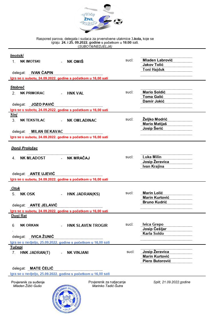 Raspored parova, delegata i sudaca za 3. kolo 1. ŽNL