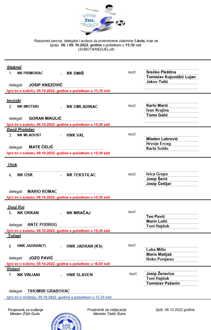 Raspored parova, delegata i sudaca za 5. kolo 1. ŽNL