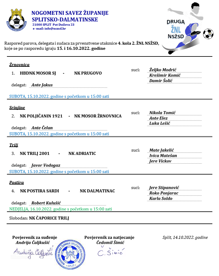 Raspored parova, delegata i sudaca za prvenstvene utakmice 4. kola 2. ŽNL