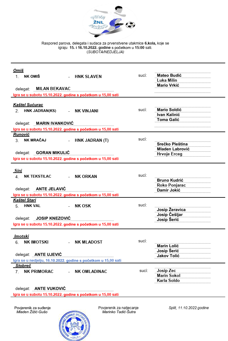 Raspored parova, delegata i sudaca za 6. kolo 1. ŽNL