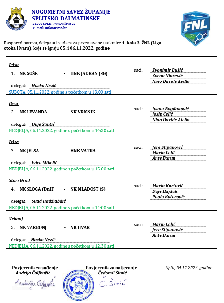 Raspored parova, delegata i sudaca za prvenstvene utakmice 4. kola 3. ŽNL (Liga otoka Hvara) koje se igraju 05. i 06.11.2022. godine