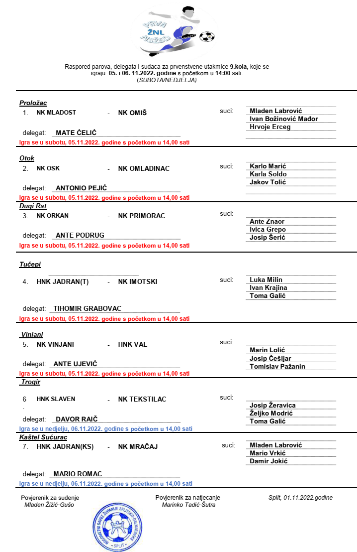 Raspored parova, delegata i sudaca za 9. kolo 1. ŽNL