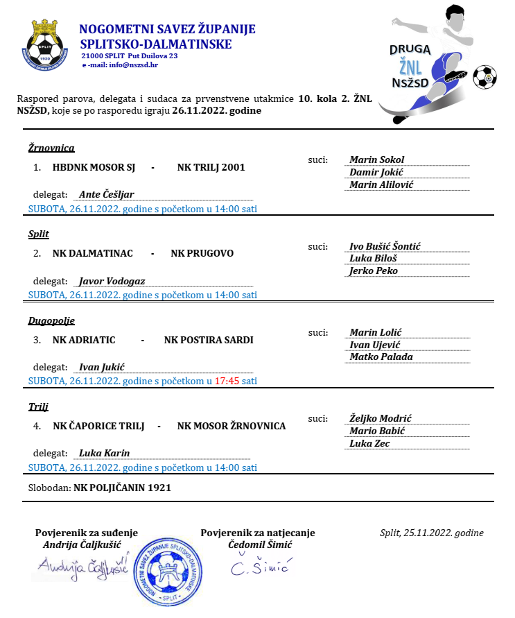 Raspored parova, delegata i sudaca za prvenstvene utakmice 10. kola 2. ŽNL