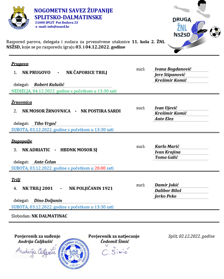 Raspored parova, delegata i sudaca za prvenstvene utakmice 11. kola 2. ŽNL