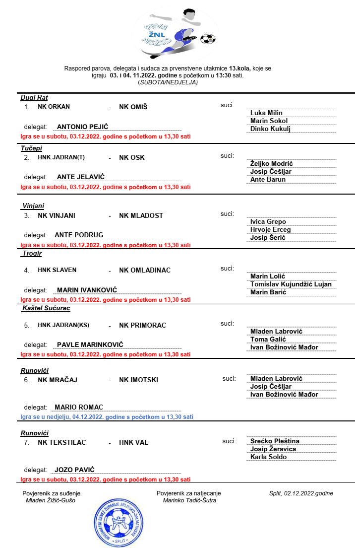 Raspored parova, delegata i sudaca za 13. kolo 1. ŽNL