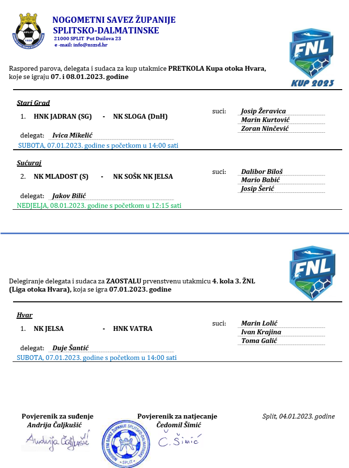 Raspored parova, delegata i sudaca za utakmice pretkola Kupa otoka Hvara i zaostalu utakmicu 4. kola 3. ŽNL