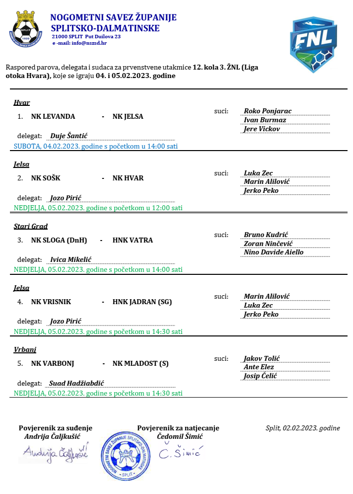 Raspored parova, delegata i sudaca za prvenstvene utakmice 12. kola 3. ŽNL (Liga otoka Hvara) koje se igraju 04. i 05.02.2023. godine