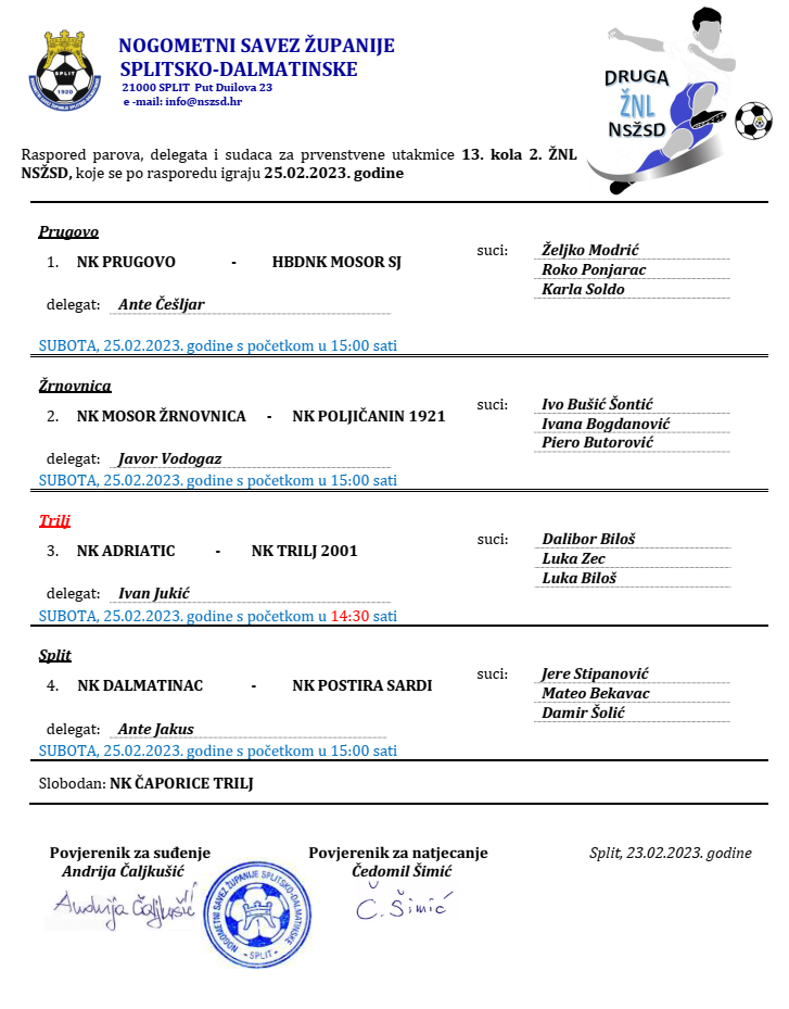 Raspored parova, delegata i sudaca za prvenstvene utakmice 13. kola 2. ŽNL