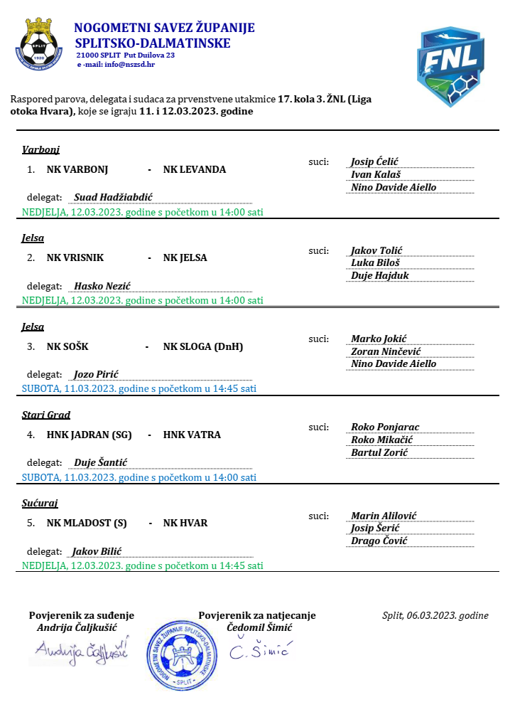 Raspored parova, delegata i sudaca za prvenstvene utakmice 17. kola 3. ŽNL (Liga otoka Hvara) koje se igraju 11. i 12.03.2023. godine