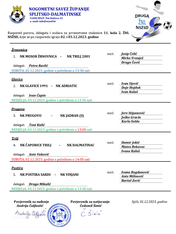 Raspored parova, delegata i sudaca za prvenstvene utakmice 11. kola 2. ŽNL