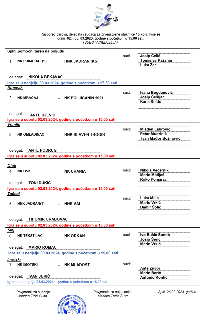 Raspored parova, delegata i sudaca za 15. kolo 1. ŽNL
