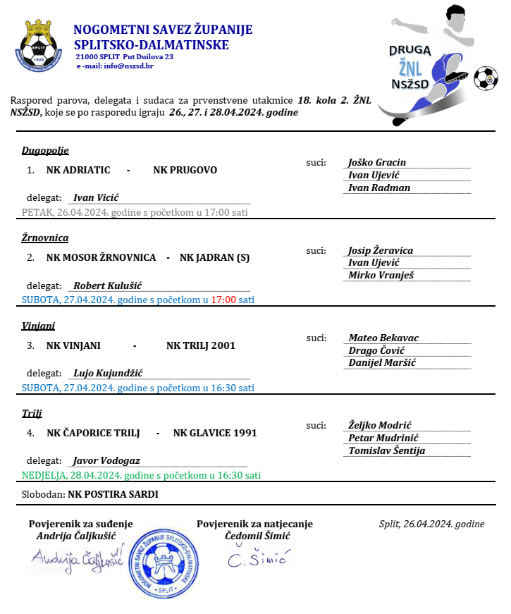 Raspored parova, delegata i sudaca za 18. kolo 2. ŽNL