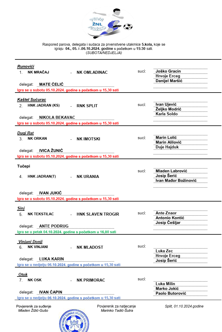 Raspored parova, delegata i sudaca za 5. kolo 1. ŽNL