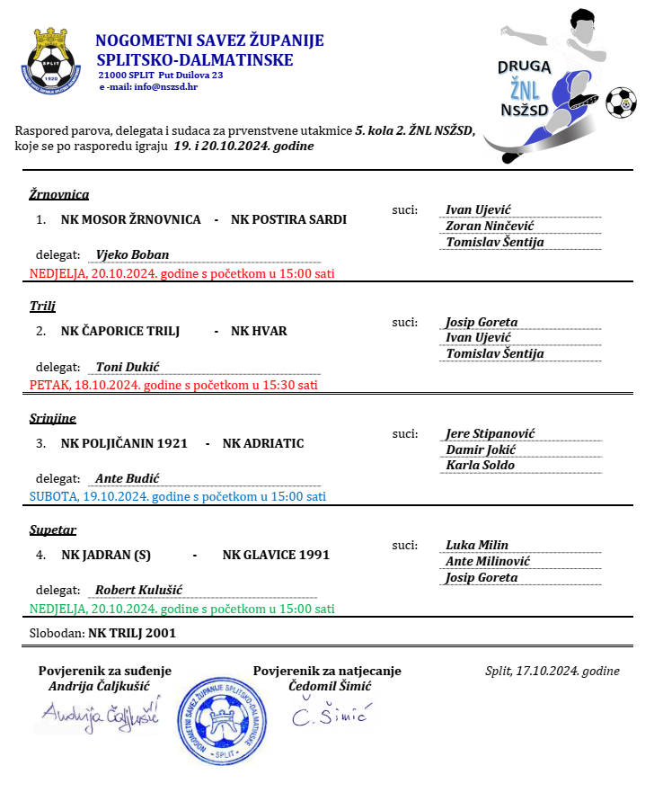 Raspored parova, delegata i sudaca za prvenstvene utakmice 5. kola 2. ŽNL