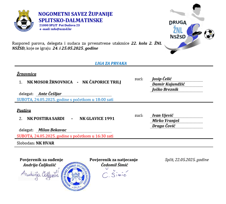 Raspored parova, delegata i sudaca za prvenstvene utakmice 22. kola 2. ŽNL