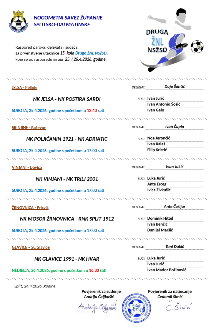 Raspored parova, delegata i sudaca za prvenstvene utakmice 15. kola 2. ŽNL